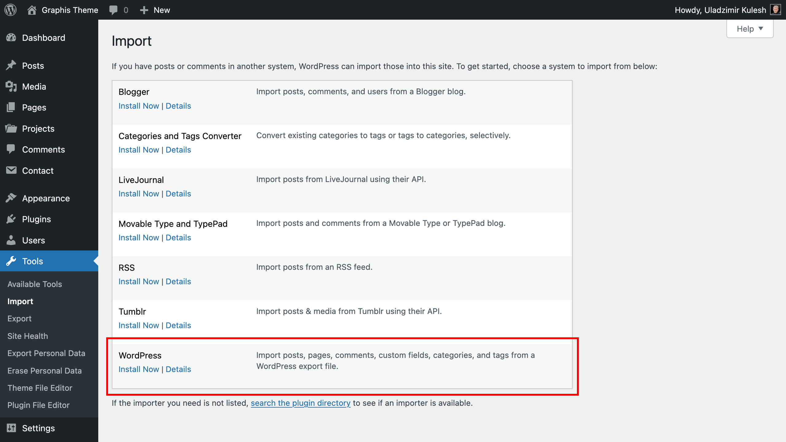 - Log-in to your WordPress Dashboard and open importer: “Tools > Import > WordPress”.