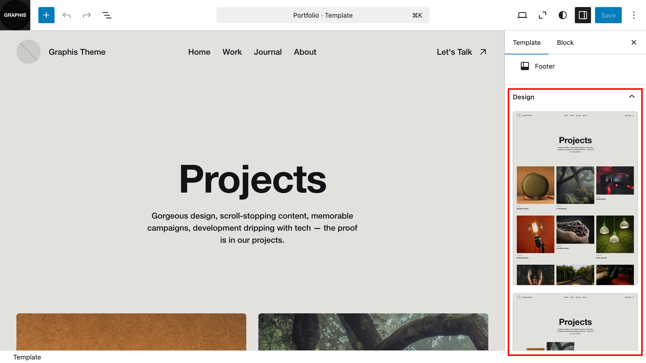 To change the appearance of the project list page in the portfolio, go to “Dashboard > Appearance > Editor > Templates > Portfolio” and in the right section select a design for your portfolio page.