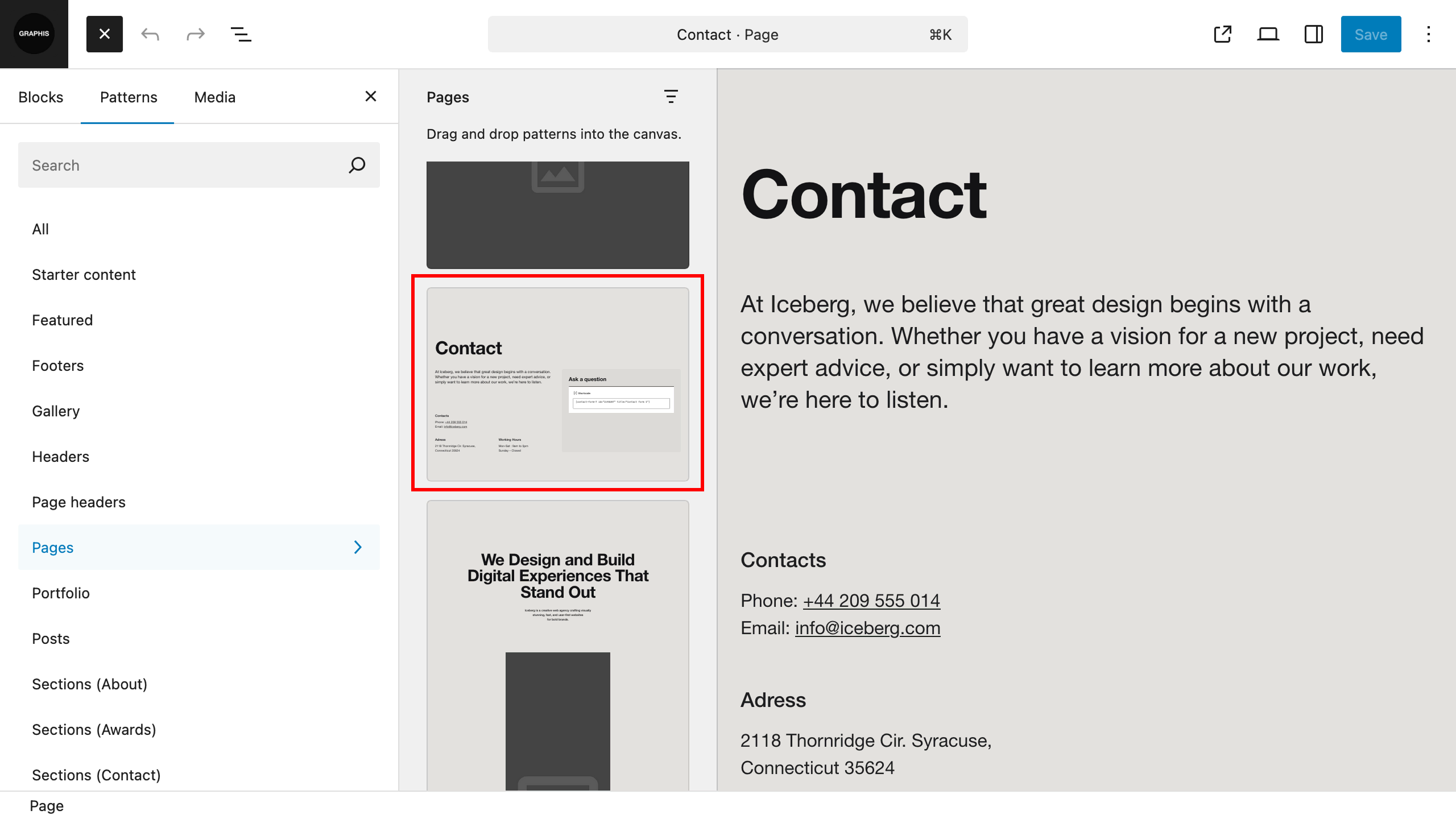 Copy your contact form shortcode. Them go to “Pages > Add New”, add title for page, add contact page pattern and insert shortcode to this pattern.