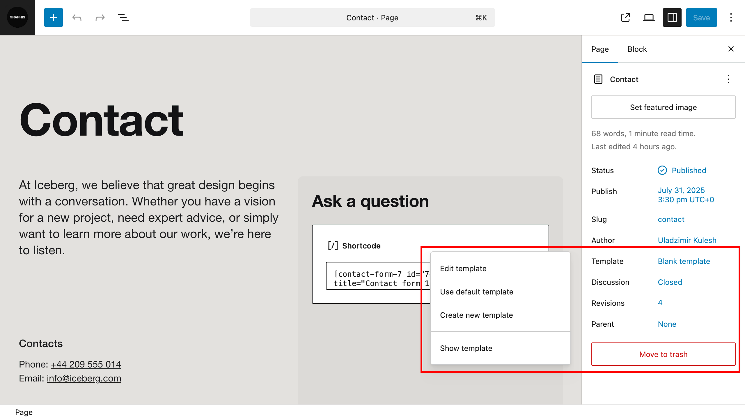 Select blank template for this page and press “Publish” button. Contact form will be displaying on this page.